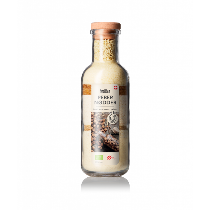 Vores Pebernødder er spækket med smagsfyldige ingredienser som mandler, ingefær, kanel og kardemomme. Den helt specielle kokosblomst sukker som er tilsat giver pebernødderne ekstra sprødhed og bid.