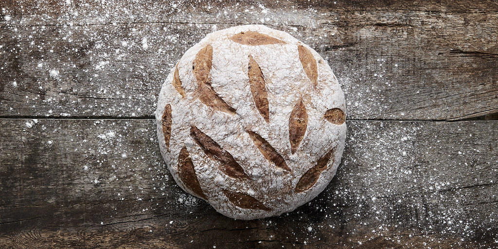 Tips: Dejen kan også deles til mindre brød og bages i 20 min. Efter 5 min. bagning kan vand forstøves henover dejen for en ekstra sprød skorpe på brødet. Når brødet bankes i bunden og det lyder hult er det færdig. Alternativt kan et stegetermometer bruges, brødet skal måle 97°C i midten.